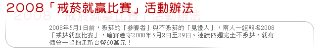 參賽者必須在比賽期間2008年5月2日~29日、連續四週完全不吸菸;見證人應於比賽期間支持及鼓勵參賽者戒菸。