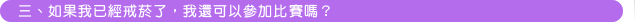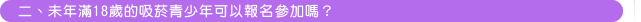 據國際大會規定,需年滿十八歲以上才可報名參加戒菸就贏比賽,而且根據國內「菸害防制法」第十一條第一項的規定:未滿十八歲者,不得吸菸。 兒童及少年福利法第二條:本法所稱兒童及少年,指未滿十八歲之人 兒童及少年福利法第二十六條第一項:兒童及少年不得為吸菸、飲酒、嚼檳榔行為。 所 以囉,未滿十八歲的青少年吸菸已違反上述法律,不能參加本次活動。