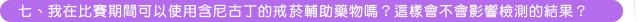 您可以在專業醫師、藥師或衛生教育人員的指導下,使用戒菸輔助藥物來幫助您戒菸。比賽期間,若您是使用含尼古丁的戒菸輔助藥物,請提供取得或購買藥物之相關證明;主辦單位亦會進行一氧化碳等相關檢測,不會影響您得獎的權益。