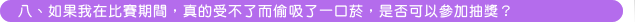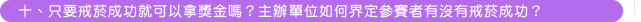 比賽規則中已清楚告知參賽者,在比賽進行的四週內,一口菸都不能吸,才具有得獎資格。所以很遺憾地,參賽者只要吸了一口菸,該組就不具有得獎資格。但仍希望參賽者能繼續戒菸,贏得自身的健康。