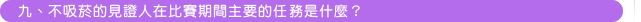 不吸菸的見證人在比賽期間,要不斷地給予戒菸參賽者鼓勵與支持,並監督參賽者在比賽期間內,一口菸都不能吸。